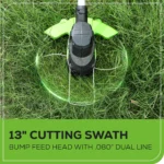 - 13″ cutting width with an Easy wind Bump feed head using 0.080″ Line allows for easy maneuverability in tighter spaces
